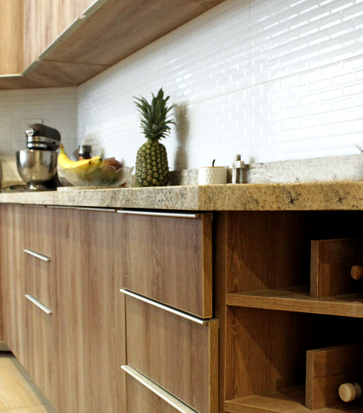 Se adecuan perfectamente a las necesidades específicas de cada usuario. En este ejemplo es una cocina que fue diseñada enteramente en melamina con un desayunador embutido en el mueble.