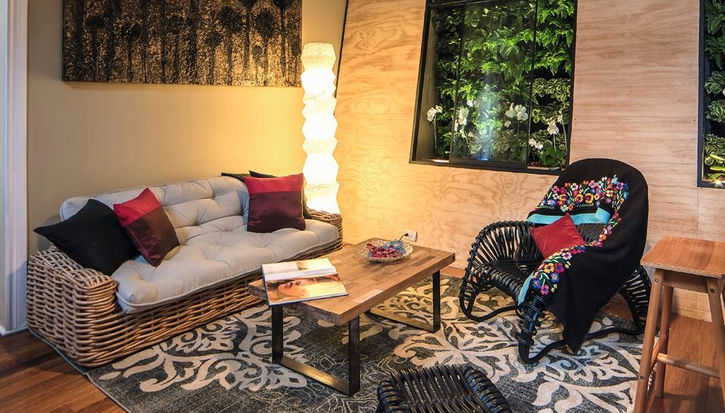 Materiales: madera, melamine, sillones de diseñador, paisajismo, luminarias.